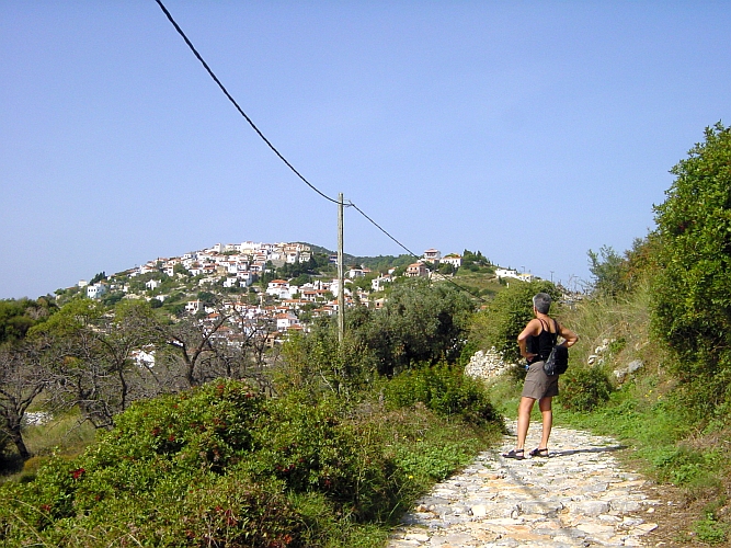 ALONNISOS (Griekenland) Er loopt een ezelspaadje door de heuvels van Patitiri naar Chora. Langs het pad bloeien kleine cyclamen. Na ongeveer een half uur ben je in Chora, de oude hoofdstad van het eiland. Officieel staat er nog Alonnisos op de kaart. Het is een oude Griekse gewoonte om de hoofdstad de naam van het eiland te geven. Of omgekeerd.