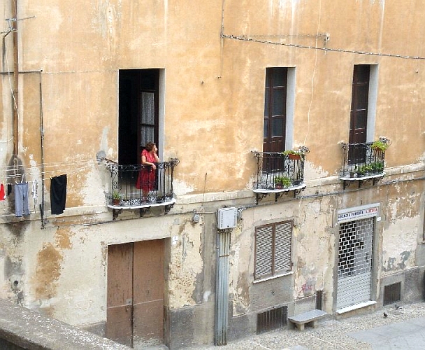 CAGLIARI (Sardinië) We staan voor de Duomo Santa Maria di Castello, de grote kathedrale kerk van Cagliari. Dertiende eeuw met een façade van licht marmer als de dom van Pisa, schrijft de reisgids er voor alle zekerheid bij. Wij staan met de rug naar de kerk en kijken over de muur de straatjes van de wijk Castello in.