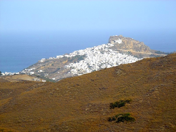 SKYROS (Griekenland) De eerste keer op Skyros was ik dik een uur onderweg om in Skyros-stad te komen. Het was warm die middag en ik volgde vanaf de kust de smalle weg die me tegelijk met de auto's, de brommers en de muilezels in ruime slingers tegen de berg op omhoog bracht. Later kwamen we er achter dat je met een lange trap in vijf minuten boven in de stad bent.